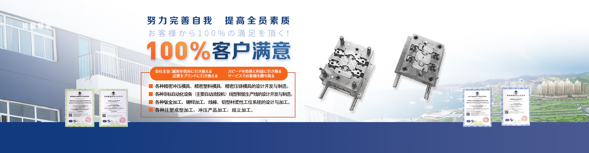 銘成精密工業(大連)有限公司位于大連市金州區鐵山中路47號,公司成立于2009年10月,現有員工40人,主要經營范圍有:各種精密沖壓模具、精密塑料模具、精密壓鑄模具的設計開發與制造。各種精密模具部品加工及機械相關的零部件加工、治具、檢具、工裝夾具的設計與加工。各種自動化設備(主要自動涂膠機)、線型智能生產線的設計開發與制造。各種鈑金加工,鉚焊加工,線棒、鋁型材柔性工位系統的設計與加工。各種注塑成型加工,沖壓產品加工,組立加工。希望用我們的品質,納期,價格,和服務贏得您的滿意與認可!公司宗旨:以誠信換取信譽 以速度換取效益 以質量換取品牌 以服務贏得客戶 質量目標:100%客戶滿意 經營方針:努力完善自我 提高全員素質 以優品質 短納期 低價格贏得客戶信賴
